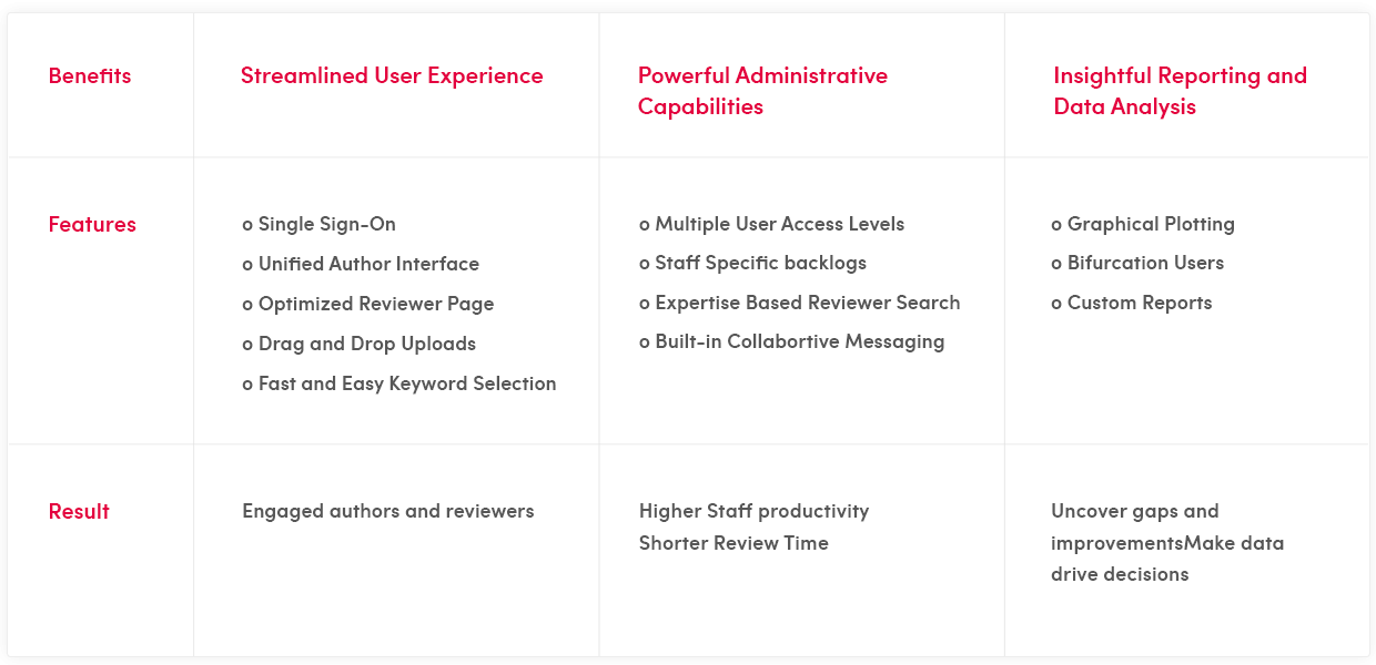 It helps manage the peer review workflows & manuscript submissions at scale, helping track the progress of the manuscript through the publication journey. At the same time, it provides insights to authors, journal staff & editors for optimization of the pre-publishing processes and resources for the same.
